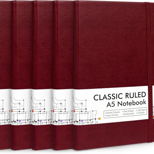 feela Journal Notebook Bulk for School, Hardcover Business Classic Ruled Lined Journals with Pen Holder for Work Office Journaling, with 5 Black Pens, 120 GSM, 5.1”x8.3”, 5 Pack, A5, Solid Colors