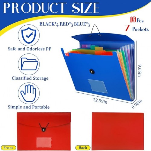 Glenmal 10 Pcs 7 Pocket File Folders File Organizer Expanding Folder with Labels Plastic Expandable Folder Pocket Folder A4 Letter Size Paper Organizer Folder for Office(Red, Black, Blue)