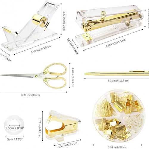 - List of Office Supplies Set:1*stapler, 1*staple remover, 1000*staples, 1*tape holder, 1*pen holder, 1*pens, 1*scissors, 1*Clear Tape and 1 box of binder clips; The size of desk accessories:stapler: 6*1.4*1.9inch, tape dispenser: 5.5*3.2*1.5 inch, staple remover: 1.77*2.56 inch, scissor: 6.3*2.5 inch, pen: 5.4 inch, pen holder: 4 *3.5inch.Such a complete gold desk accessories combination is enough to meet your school and office using needs.