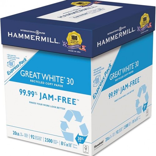 - 30% RECYCLED PAPER – Hammermill Great White recycled printer paper is made from post-consumer fiber. It is versatile paper with precise, accurate sheeting, consistent moisture content and curl control to ensure smooth, trouble-free performance.
