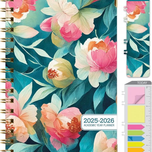 HARDCOVER Academic Year 2025-2026 Planner: (June 2025 Through July 2026) 5.5″x8″ Daily Weekly Monthly Planner Yearly Agenda. Bookmark, Pocket Folder and Sticky Note Set (Small Navy Floral)