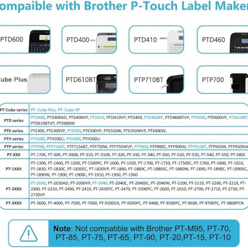- Compatibility: Works with Ptouch label makers including PT-D/PT-P/PT-E/PT-H series (PTD400, PT-P710BT, PT-E550W, PT-H500LI, etc.) and PT series models (PT-1800/1900/2040, etc.)