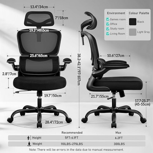 - 【Space-Saving Flip-Up Armrests】Designed with flip-up armrests, this office chair allows you to easily fold the padded arms up to 90° for space-saving convenience. Push the desk chair under your desk to free up valuable floor space. This versatile chair is ideal for use in home offices, meeting rooms, and gaming setups, with a stylish Light Gray color that suits any environment.