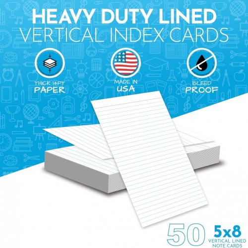 - DETAILS: (50 pack) 5” x 8” double sided, blue lined note cards with header portion at top of card. Lines printed on thick 14PT heavy duty un-coated white card stock paper for writability.