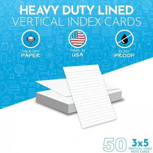 - DETAILS: (50 pack) 3” x 5” double sided, blue lined note cards with header portion at top of card. Lines printed on thick 14PT heavy duty un-coated white card stock paper for writability.
