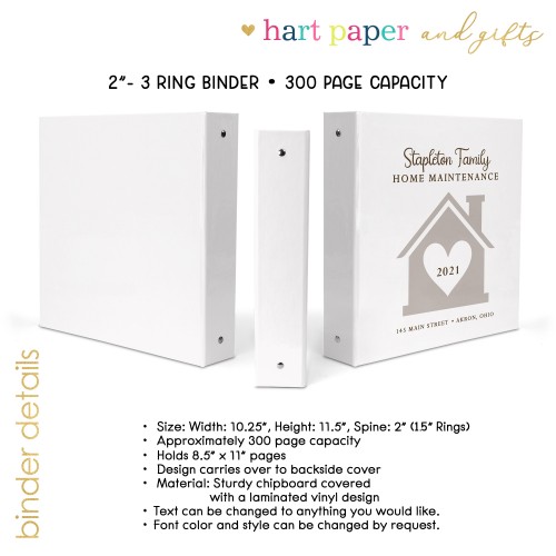 Keep your home documents in one easy-to-access place with our custom 3-ring binders—perfect for organizing warranties, renovation records, appliance manuals, receipts, and other essential paperwork. Whether you’re a new homeowner, a DIY enthusiast, or managing a rental property, this binder helps you stay on top of it all—with a personal touch.