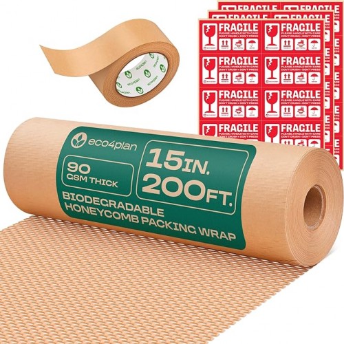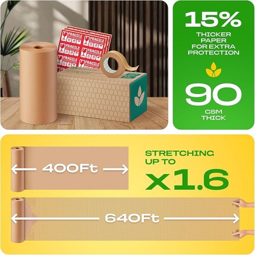 Honeycomb Packing Paper | Extra Thick 90 GSM Packing Wrap | Biodegradable Packing Materials: 12” x 400’ Moving Paper + 195’ Cellulose Adhesive Tape + 30 Fragile Stickers | Paper Bubble Wrap