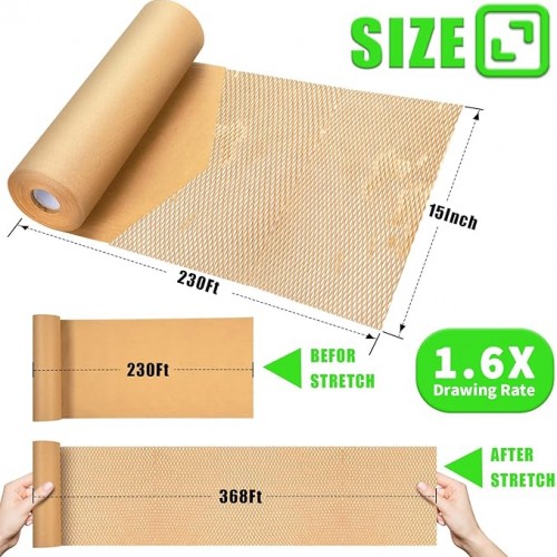 - ♻️Sturdy And Reliable Packing Paper For Moving — Our honeycomb packing paper is made of 80GSM high quality kraft paper. It’s also lightweight and portable, saving you space and hassle during shipping. But what sets our honeycomb cushioning paper apart is its high 1.6X stretchability, which allows you to wrap items tightly and provides an excellent barrier between your items and the boxes they’re shipped in and provides more peace.
