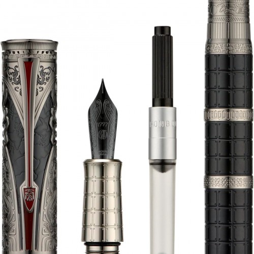 Hongdian D5X Fountain Pen Extra Fine Nib Black Color, Qin Dynasty Retro Chinese Totem Engraving Smooth Writing Pen with Converter and Pen Box Set