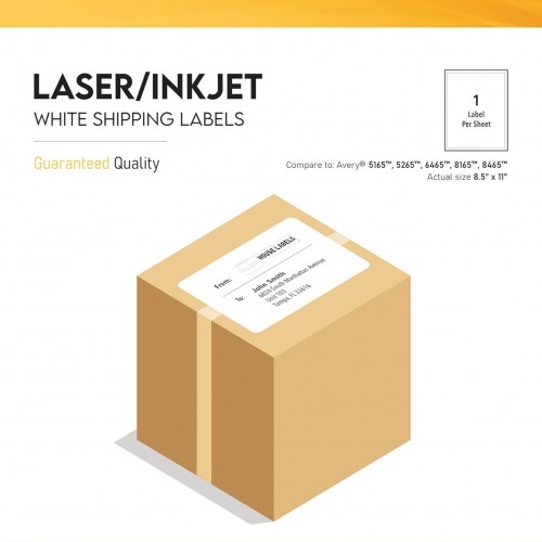 - Color: White; Size: 8.5″ x11″; Corners: Square Labels per Sheet: 1