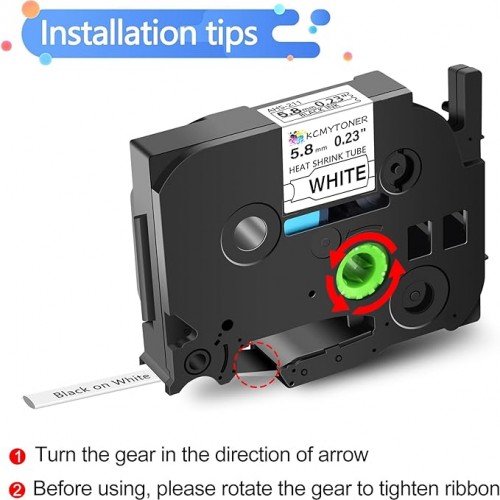- Package Included: 2 pack KCMYTONER compatible for ptouch HSe-211 HS-211 HSe211 HS211 heat shrink tube label tapes; color: black text on white tape; size: 1/4 inch (5.8mm, flattened width) x 4.92 feet (1.5m).The size indication for this heat-shrink tube label is the width of the flattened tube as a label in a label printer. Do be aware that the size given relates to the label making machine, not the wire. HSe-211 5.8mm tube suits cables ranging from Φ1.7mm to Φ3.2mm in diameter.