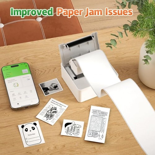 - Upgraded Paper Tray – The built-in paper tray of the mini sticker printer can reduce paper jams, improve printing efficiency, and achieve faster paper output