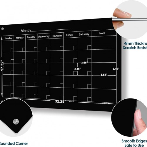 J&J worldwide Magnetic Whiteboard Calendar, 3′ x 2′ Blsck Glass Wall Calendar Dry Erase Board Monthly Planner for Home, School, Office, Frameless, with Markers, Marker Tray, Eraser, Magnets