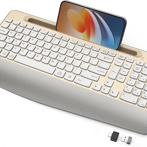 - Wireless keyboard with Wide Wrist Rest & Adjustable Tilt:This wireless ergonomic keyboard is thoughtfully equipped with a wide wrist rest and adjustable tilt feet, allowing your wrists and forearms to stay in a naturally relaxed position during use for lasting comfort. It features a dedicated volume control knob for more convenient and efficient volume adjustment, along with 12 multi-function keys and multimedia shortcuts, helping you handle various tasks quietly and efficiently