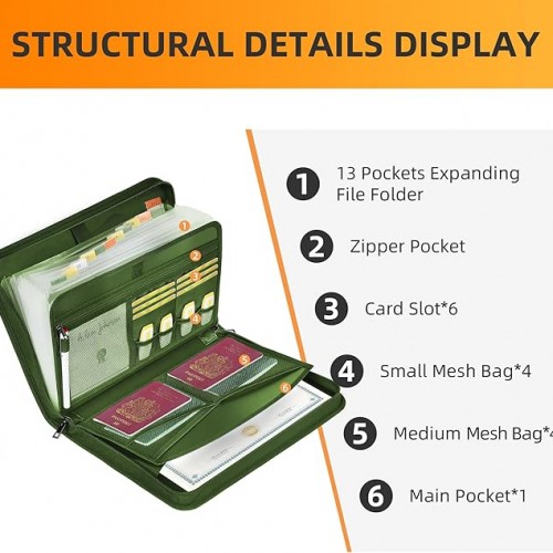 JUNDUN Accordion File Organizer – Fireproof Accordion Folder with Zipper & Labels – 12 Pocket Expanding File Folder with Multi-Pockets Paper Organizer Folder for Letter A4 Files More (Green)