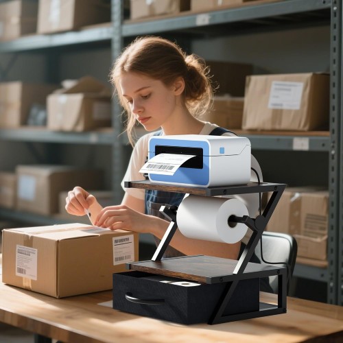 - 【All-in-One Design】: This label roll holder can accommodate both a thermal label printer and a label roll at the same time. There are holes on both sides of the top shelf, which can neatly hide the power cord. The bottom drawer is designed to not only store printed labels, pens, and other small items while keeping out dust, but can also be pulled out separately to use as a desktop organizer