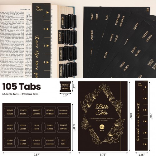 Laminated Bible Tabs, Gold Foil Embossed Lettering Bible Chapter Index Tabs for Women Men, Reposition Large Print Sticky Labels, Easy to Read and Apply, 105Chapters Labels for Easy Navigation (Black)