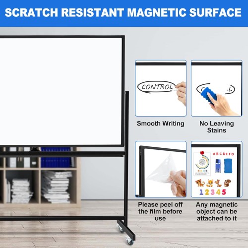 - EASY TO ERASE SURFACE & EASY FLIP DOUBLE SIDED DRY ERASE BOARD —- Our large whiteboard 72″ x 48″ allows for both easy erase cleaning and protection from dents and scratches. Quick Flip Over Reversible Feature, Flip the board to the other side with the press of a button. You have TWICE the writing space when you utilize BOTH sides of the portable writing whiteboard with stand.