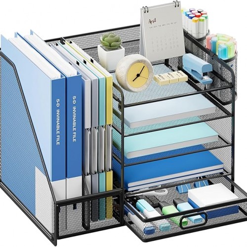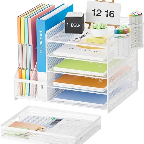 - Multiple Use: Our office organizers owns 5 sliding trays + 2 Magazine Holders + 2 Hanging Pencil Holders + 1 sliding large capacity drawer which have enough storage space to accommodate all your office supplies and keeps your desktop neat, which is very suitable for offices and schools.