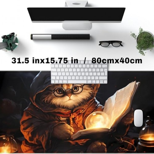 Magical Cat Desk Mouse Mat Black Vintage Desk Pad Playmat for MTG Large Mousepad Gaming Deskpad XXL Keyboard Mouse Pad Full Desktop Mat Desk Cover Mat for Work Office Home (31.5×15.7 in)