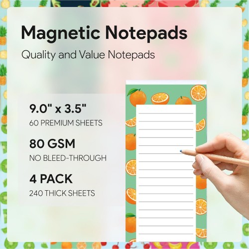 - LARGE PAGE SIZE 60 SHEETS – 4 Large magnetic memo pads measure 9” Height x 3.5” Width in inches, BIG SHEET SIZE provide more space for comfortably writing notes. Each pad contains 60 sheets for long lasting use (total 240 sheets) sheets made with high quality thick uncoated paper, great for writing with less chance of ink bleed through. 4 realistic fruits themes, total 4 unique large note pads magnetic.