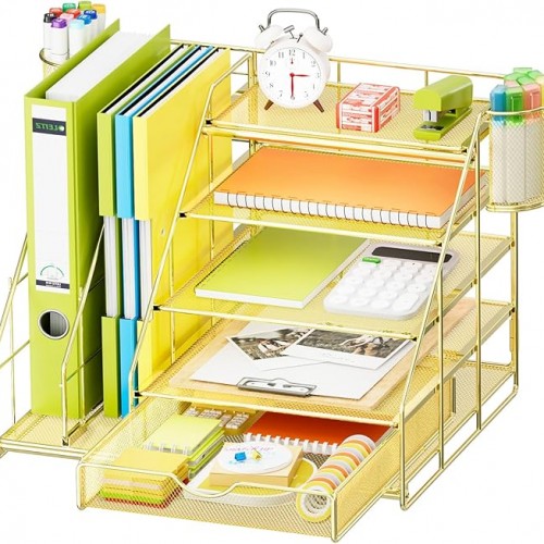 Marbrasse Desk Organizer and Accessories,4-Tier Paper Letter Tray Organizer with File Holder, Desk Accessories & Workspace Organizers with Drawer and 2 Pen Holder (Blue, 15.4″ x 9.1″ x 8.3″)