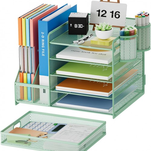 Marbrasse Desk Organizer with File Holder, 5-Tier Paper Letter Tray Organizer with Drawer and 2 Pen Holder, Mesh Desktop Organizer and Storage with Magazine Holder for Office Supplies (Green)