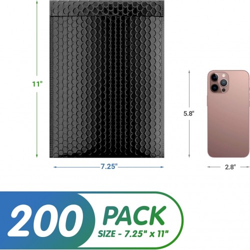 Matte Black Poly Bubble Mailers Self Seal, 7.25 x 11 Inch. Pack of 200 Bubble Packaging Envelopes for Shipping. Durable Padded Envelopes Waterproof. Self Seal Padded Mailers. Shipping Packages