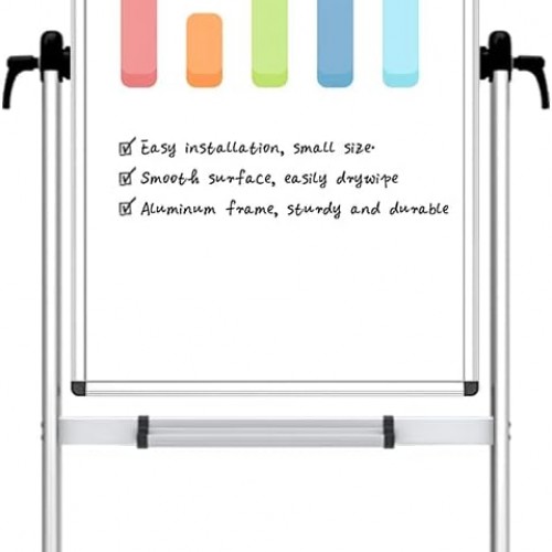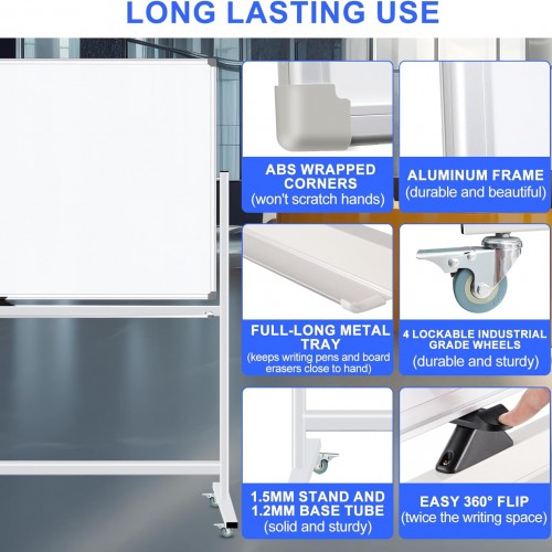 - [EASY TO ERASE SURFACE & EASY FLIP DOUBLE SIDED MAGNETIC DRY ERASE BOARD] —– Our large 72″ x 40″ lacquered steel mobile whiteboard allows for both easy erase cleaning and protection from dents and scratches. Quick Flip Over Reversible Feature, Flip the board to the other side with the press of a button. You have TWICE the writing space when you utilize BOTH sides of the portable rolling whiteboard with stand.