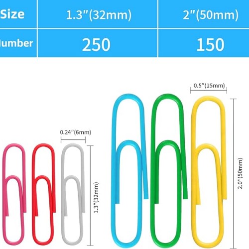 - Brighten your workspace with these multicolored jumbo paper clips! The vibrant mix of colors (blue, green, pink, yellow, and more) adds a fun touch to organizing documents, making them easy to spot and sort.