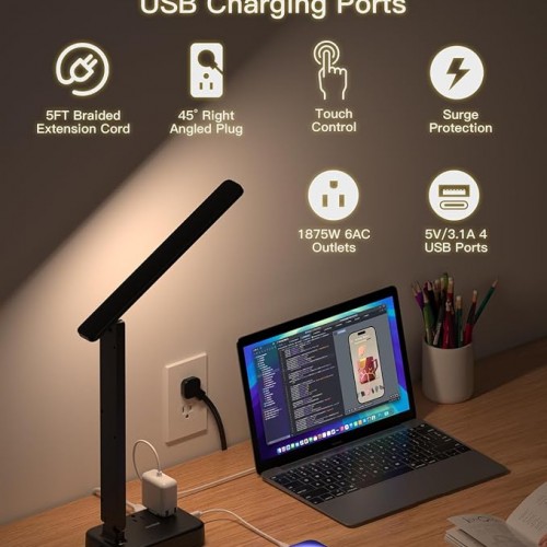 - 【 Multi-Functional Deskop Essentials 】 This usb c power strip with 45° low profile right angled flat plug and 5 ft extension cord, you can carry it anywhere. It not only a table lamp, but also a multi-function desktop power strip wtih usb charging station.You can easily choose a variety of lights for painting, reading, writing, crafts, nail charms, kindle reading lighting needs. easily adjust the brightness by touch. Cool white lighting great suit for working, studying, reading.