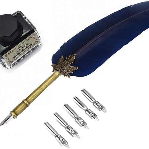 OPENDGO Feather Quill Pen Set with Ink Antique Feather Copper Pen Stem Calligraphy Set Quill Pen Writing Quill Ink Dip Pen with 5pcs Nibs in Different Size