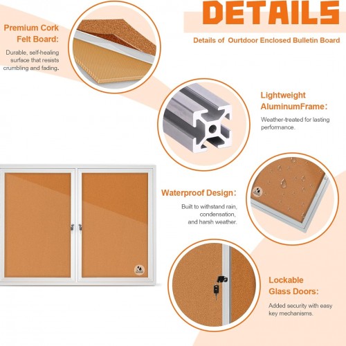 - Weatherproof Outdoor Bulletin Board for Reliable Displays: This outdoor bulletin board weatherproof design makes it a dependable solution for both indoor and outdoor use. Built with durable aluminum and weather-sealed doors, it keeps your important notices safe from rain, wind, and dust. Ideal for schools, office buildings, and community centers, this weatherproof bulletin board ensures your messages stay clear and visible in any condition.