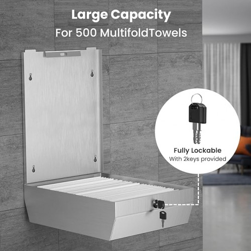 Paper Towel Dispenser Wall Mount Commercial, Stainless Steel Hand Towel Dispenser with Lock, c-fold/Multi-fold/Tri-fold Large Capacity Tissue Holder