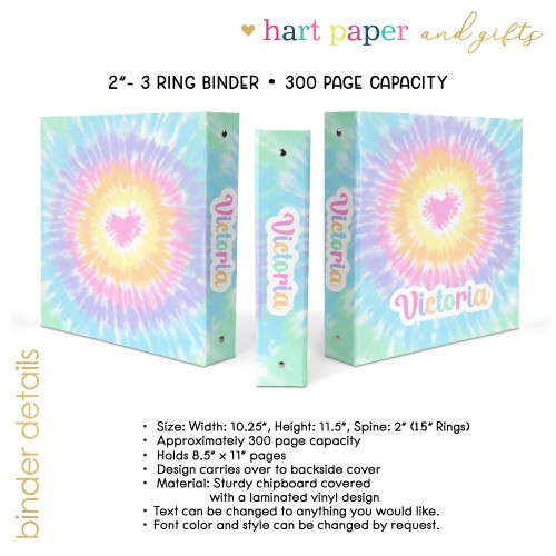 Pastel Rainbow Heart Tie Dye Personalized Custom 2″ 3 Ring Binder • School Office Supplies