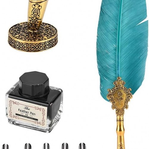 PATIKIL Feather Quill Pen Set, 1 Set Vintage Feather Calligraphy Pen Fountain Dip Pen Set with Ink, Pen Holder and Replacement Nibs for Beginner Writer Writing Gift, Navy Blue(Silver Box)