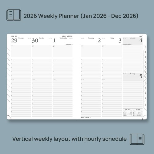 - 2 PAGES PER WEEK HARDCOVER:Lay flat week-to-view on 2 pages, this weekly planner (Jan 2026 – Dec 2026) presents spacious everyday planning with hourly schedules for your appointments, which makes your busy daily routines organized.