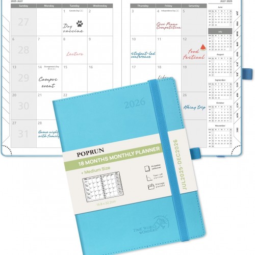 POPRUN Monthly Planner 2026-2027 (Medium- 6.5” x 8.5” Soft Cover), 18-Month Calendar Book (Jan.2026 – Jun. 2027), Calendar Planner with Monthly Tabs & Pocket, 100 GSM Paper – Night Sky Blue