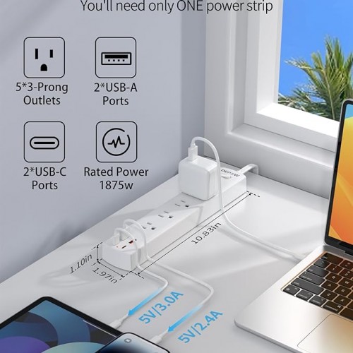 - 【Expand 1 Outlet to 9 Devices】-Power up 5 grounded AC outlets (1875W/15A) + 4 USB ports (2 USB-C) simultaneously—ideal for home offices, workshops, or dorm rooms. Say goodbye to outlet shortages with this space-saving surge protector power strip.