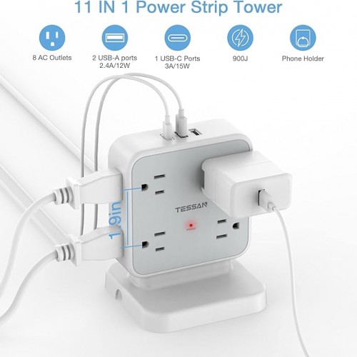 - Multi Outlet Tower Power Strip: TESSAN power strip tower with USB has 8 AC widely spaced outlets and 3 USB ports (1 USB-C), which USB A ports can charge up to 2.4A/12W, and the USB C port can charge up to 3A/15W; Can power up to 11 devices simultaneously