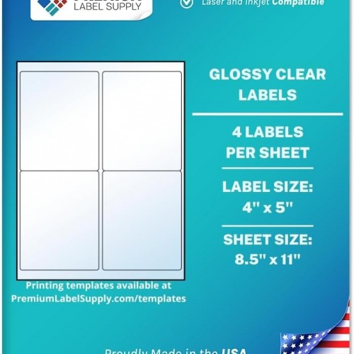 Premium Label Supply Glossy Clear Labels – 4″ x 5″ – Laser/Inkjet Compatible – (4 per Sheet), 10 Sheets – 40 Total Adhesive Labels