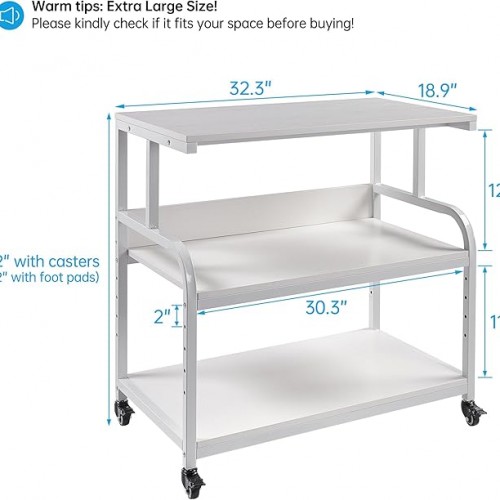 - 【Large Storage Space】With overall product dimensions of 32.3″W x 18.9″D x 30.2″H/32.2″H and a weight capacity of 120lb on each tier, this stand is designed specially for large and heavy printers, scanners, wide format printers and other bulky equipment. Additionally, 3 tier storage shelves offer spacious room for organizing and storing office supplies such as paper, toner, and more, ensuring easy access while working or studying.
