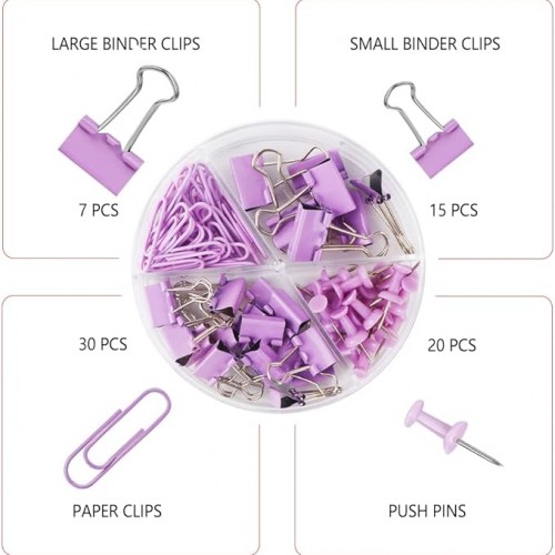 Purple Binder Clips and Paper Clips Push Pins Tacks Sets, Total 72 PCS Assorted Sizes Office Supplies Set for Women, Student, School, Home & Desk Supplies