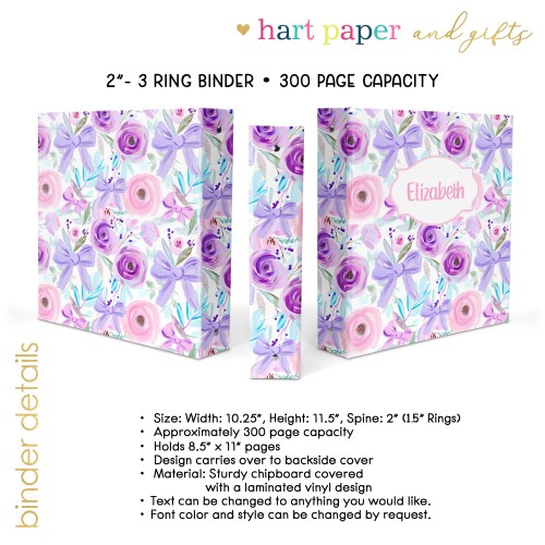 Purple Bow Coquette Flowers Personalized Custom 2″ 3 Ring Binder • School Office Supplies
