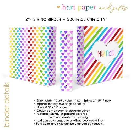 Rainbow Hearts Stripes Personalized Custom 2″ 3 Ring Binder • School Office Supplies