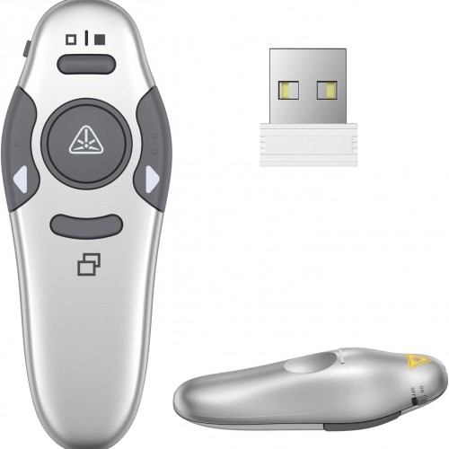 - [COMPACT METAL PPT Remote Control] Anti-drop metal power point remote clicker has a super quick response and works well without the need of any software installation, just plug-and-play. Slideshow clicker supports Volume Control,Green Light Pointer, Switch Windows, Full/Black Screen, Page Up/Down.