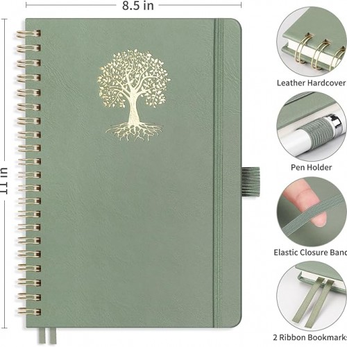 RETTACY Bullet Dotted Journal Notebook, 110 Pages, A4 Large Size (8.5″ × 11″), Leather Hardcover, 100 GSM Thick Paper, Spiral-bound, for Bullet Journaling, Planning, Tracking (Light Green)