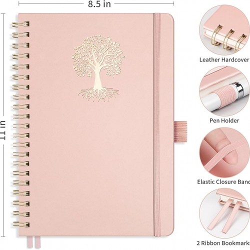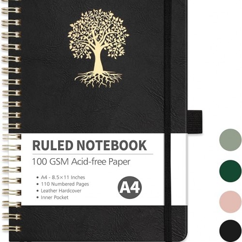 - SPIRAL NOTEBOOK: RETTACY Spiral Notebook comes in a A4 (8.5” × 11”) size, 110 Numbered Pages, Leather Hardcover, Sturdy Twin-wire Spiral Bound, 7 mm college ruled writing space, 100 GSM Paper, Pen Holder, Elastic Closure Bands, Inner Pocket, Ribbon Bookmark, Lightweight Ruler, Sticky Index Tabs