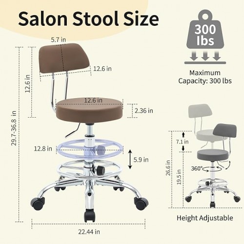 Salon Rolling Chair, Adjustable Stool with Footrest and Back 19.5’’-26.6’’,Coffee Brown Massage Stools with Wheels (Coffee Brown)