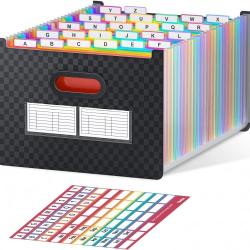 Sooez 24 Pockets Expanding File Folder with Blank Labels, According File Organizer with Expandable Cover, Desktop Accordion Folders Letter A4 Paper Document Storage Organizer, Black